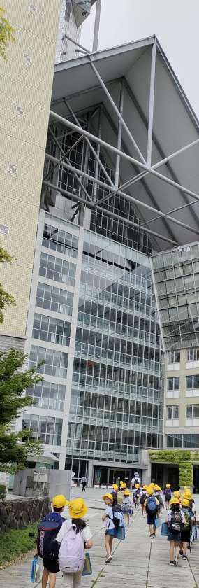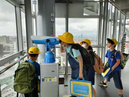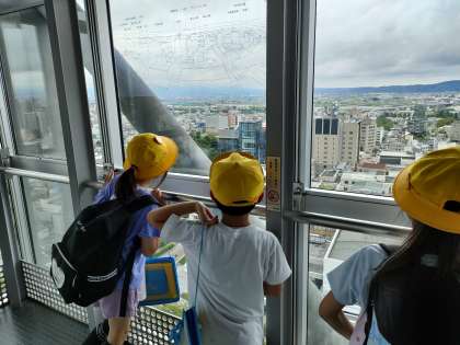 美味しいお弁当のあとは、少し遊んで記念撮影をしてから、富山市役所の展望塔に到着しました。県総合運動公園やファボーレが見えて、子供たちは、大喜び。これで、全ての予定を終え、学校に戻ります。富山市の様子について、たくさんの発見ができた子供たちでした。