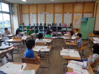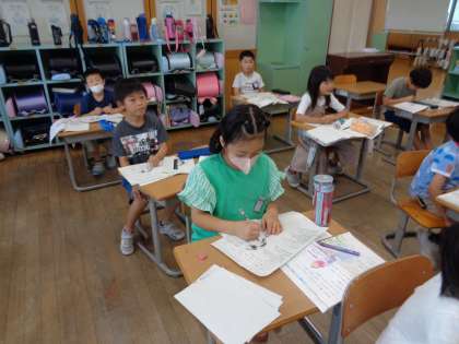 国語科の学習では、「スイミー」の学習を行っています。兄弟がマグロに食べられてしまった後、スイミーはどのような気持ちで海を泳いだのかをスイミーの立場に立って考えました。
