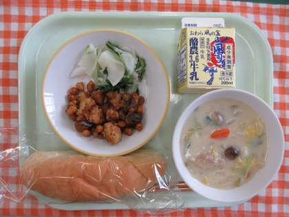 今日の献立は、米粉コッペパン、魚と大豆のえごまだれからめ、かぶのサラダ、白菜の中華クリーム煮、牛乳です。