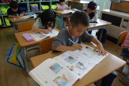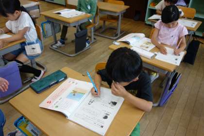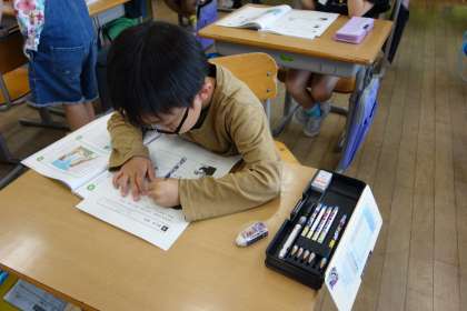 道徳科の学習の様子です。ワークシートに自分の考えを書いています。ひらがなを覚え、少しずつ自分の意見を書くことができるようになってきました。