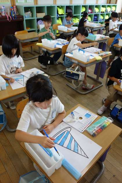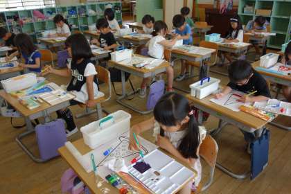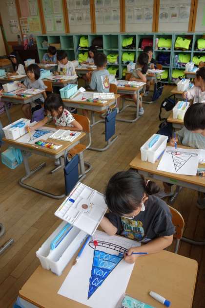 図画工作科の様子です。前回の水彩の学習を生かして、オリジナル帽子を描きました。