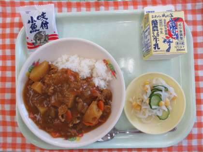 今日の献立は、カレーライス、大根サラダ、味付け小魚、牛乳です。
