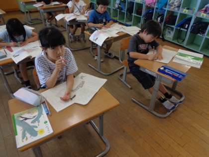 国語科の学習では、「スイミー」について学ぶ中でスイミーが大きな魚のふりをして、マグロを追い払ったときのスイミーの気持ちを考えました。様々な場面のスイミーの気持ちを考え、スイミーの心情の変化に気付くことができました。