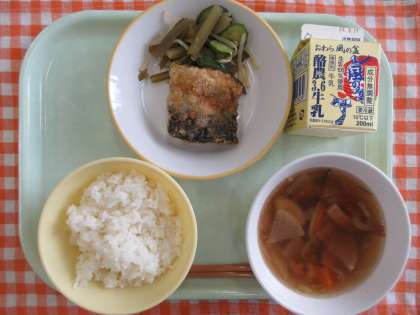 今日の献立は、ごはん、魚の梅風味かば焼き、茎わかめの中華和え、根菜スープ、牛乳です。