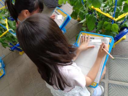 伸びてきたあさがおのつるを観察しました。中には、小さなつぼみが出始めている子もいて、細かいところまで観察していました。