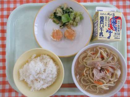 今日の献立は、ごはん、ニンジンシューマイ、しょうがひたし、とんこつラーメン、牛乳です。