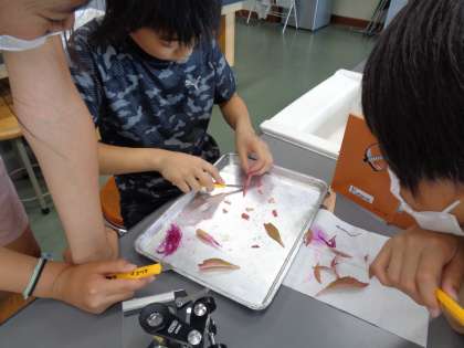 ホウセンカの根から吸収した水の通り道を調べるために、色水を使った「水の吸い上げ実験」を行いました。くきや葉の道管を通って、水が植物全体に行き渡っていることが分かりました。