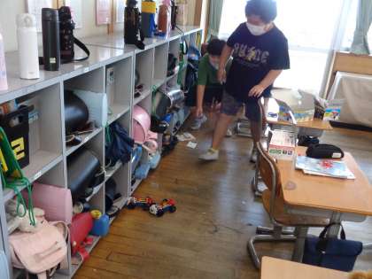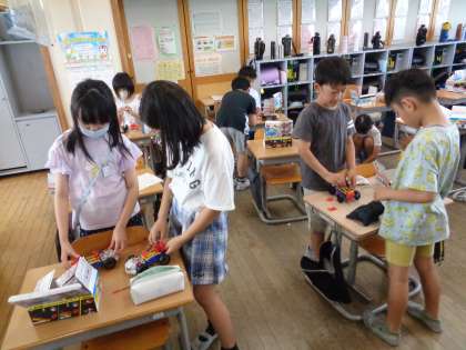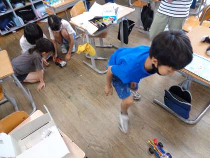 電流のはたらきで学習したことを生かし、速く走る車、電池が長持ちする車、端子を付け替えると前にも後にも走る車など、思い思いのモーターカーを作って走らせました。