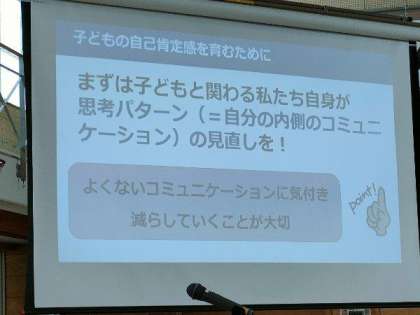 学習参観後、「家庭教育学級」を実施しました。講師の先生をお招きし、「子供の自己肯定感を育む子育てコミュニケーション」について、ご講演をいただきました。保護者の方々も質問に答える参加型の講演で、生活や子育ての中で、ネガティブな部分をポジティブに変換していこうと考えさせられた有意義な時間となりました。