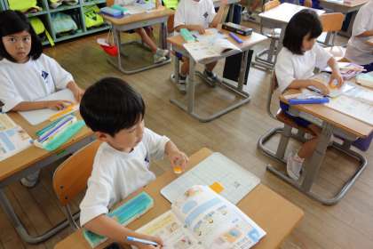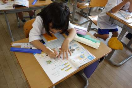 ブロック操作を通して問題場面を把握し、立式しました。一度ではできるようにはなりません。何度も練習していきましょう。