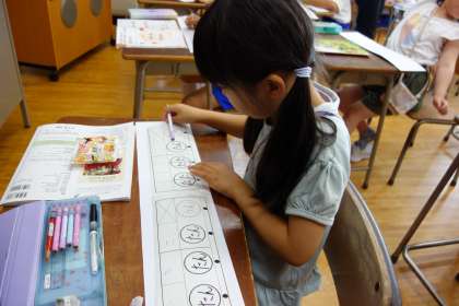 果物や食べ物を口に出して、リズム遊びをしました。自分で好きな「繰り返し」や「組み合わせ」のオリジナルのリズムをつくりました。