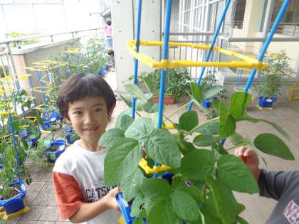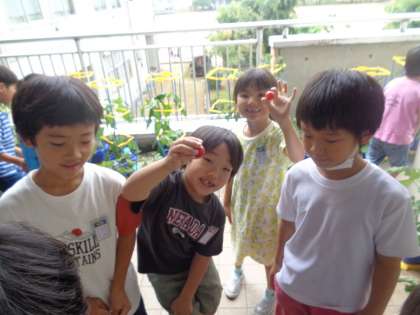 一生懸命に育てた野菜に実がなりました。子供たちは、「頑張って育ててよかった」と達成感を感じていました。