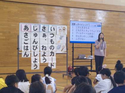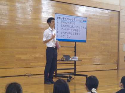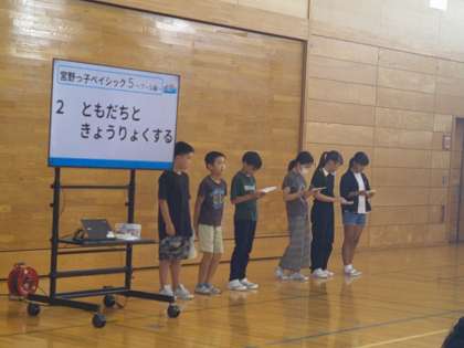 朝、プール開きの式があり、運動委員会の児童による「宮野っ子ベイシック5〜プール編〜」の発表がありました。時間を守る、友達と協力する、プールサイドは歩く、先生の指示を聴く、ふざけない…という5つの約束です。また、養護教諭からは「あじさい」という合言葉で「あ(あさごはん)」「じ(じゅんびしよう)」「さ(さあ、ねよう)」「い(いつものカード)」と健康面からの話がありました。校長先生からは、実際の体験をもとに、約束を守ることの大切さを教えていただきました。
