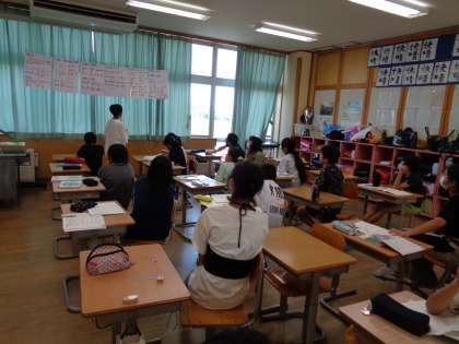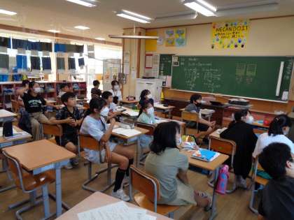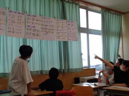 子供が先生になって、算数の既習内容を振り返っている場面です。「ここ分かる?」「これは、こんなふうに考えるといいよ」など、すてきな言葉が飛び交っていました。