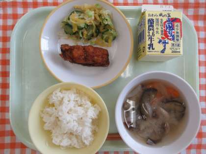 今日の献立は、ごはん、揚げ魚のレモン味、あわせ和え、具だくさん汁、牛乳です。
