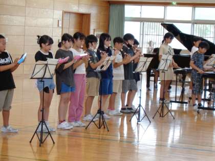 音楽の授業で練習を積み重ねた「さんぽ」を全校のみんなに聴いてもらいたいという思いから、昼休みにコンサートを開きました。体育館には、たくさんの児童、先生方が集まりました。堂々と演奏し、大きな拍手をもらった6年生の子供たちは、とてもうれしそうな様子でした。