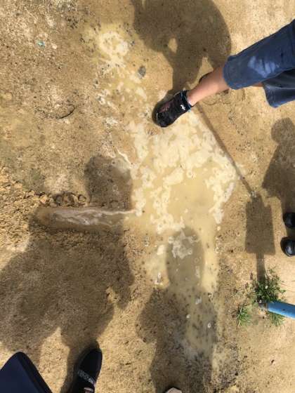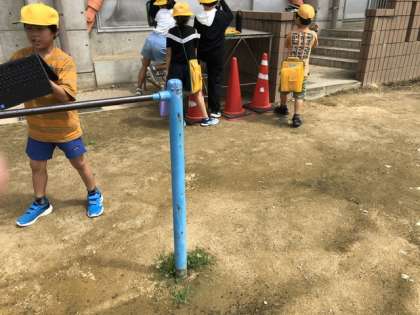 グラウンドに向かい、水たまりができそうなところを探しにいきました。鉄棒の下や校舎の隅に水たまりがあった跡を見つけることができました。
