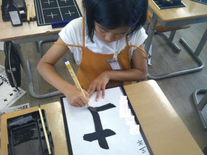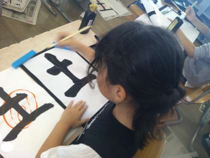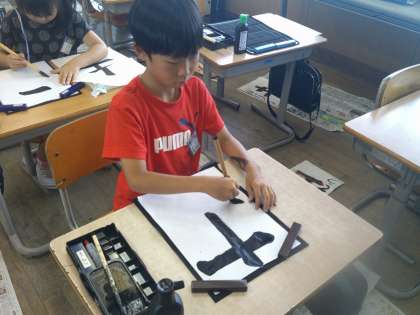 前回学習した「よこ画」と、先週練習した「たて画」の書き方に気を付けて、「土」を書きました。姿勢を正し、始筆も終筆も「穂先を左斜め上」を意識して書きました。筆づかいが、どんどん上達している3年生です。