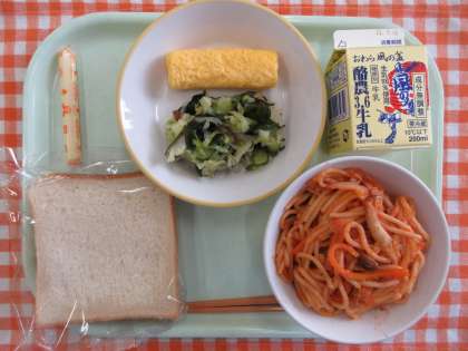 今日の献立は、食パン、ツナとトマトのスパゲッティ、卵ロール、海藻サラダ、棒チーズ、牛乳です。