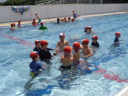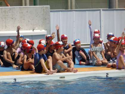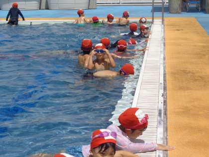 今日の水泳学習では、バタ足に挑戦しました。手や足を伸ばして、浮いていられる姿勢をつくり、できなくても何度も取り組む姿が見られました。