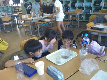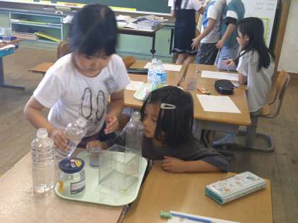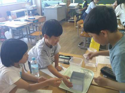 コップや身近にある容器に入る水のかさをグループの友達と協力して調べました。1リットルや1デシリットルのかさの感覚がつかめてきたようです。