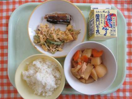 今日の献立は、ごはん、さんまのしょうが味、ベーコンとゴーヤの卵炒め、炊き合わせ、牛乳です。