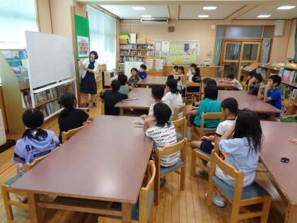 図書室に行って、司書の先生に読み聞かせをしていただいたり、夏休み中の読書におすすめの本を紹介していただいたりしました。