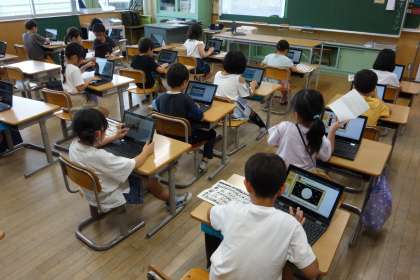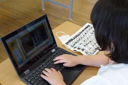 キーボードに慣れてきた子供たち。少しずつローマ字入力にも慣れていきます。3文字のローマ字入力にチャレンジしている子供もいました。