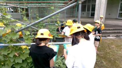 4年生 へちまの観察をしたよ 公開日 2023/07/14 更新日 2023/07/14 4年生 暑くなるとへちまの様子も変わってきました。子供たちは、大きくなったへちまの様子をよく見て観察しています。