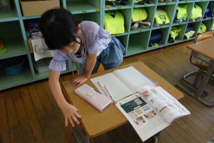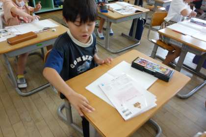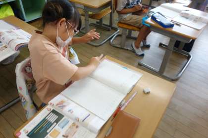 算数科の学習の様子です。自分で手を使って、机の縦と横の長さを比べました。