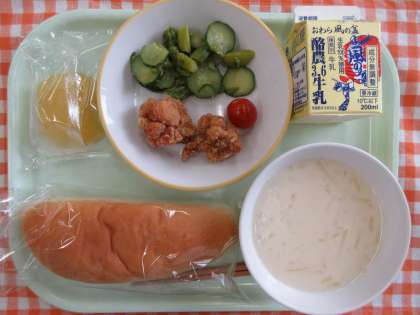 今日の献立は、コッペパン、フライドチキン、アスパラサラダ、ビーンズポタージュ、ミニトマト、牛乳です。