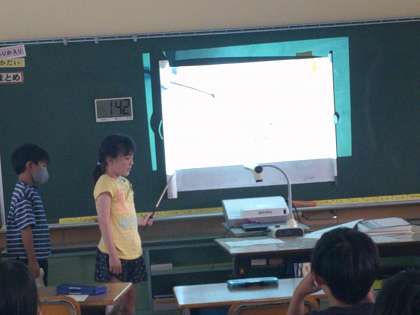 今回は、全員の前で発表しました。友達の発表を聞いた後に、質問や感想を伝えたいとたくさんの子供たちが手を挙げていました。大盛り上がりの楽しい時間となりました。