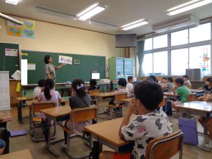 朝の読み聞かせでは、「ばばばあちゃんのアイスパーティ」というお話を読んでいただきました。夏にぴったりのお話で、なんでも凍らせてしまうお話に子供たちは興味津々。「人形凍ったら本当に食べられるのかと思った。」「なんでも凍らせすぎ!!」など子供たちらしい発言も聞こえてきました。