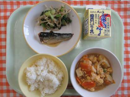 今日の献立は、ごはん、いわしのマーマレード煮、チンゲンサイびたし、高野豆腐の錦とじ、牛乳です。