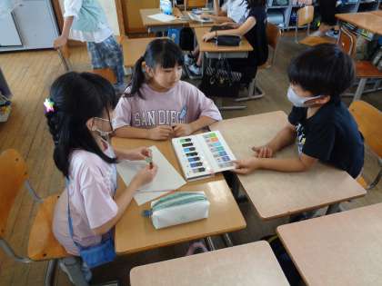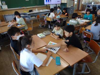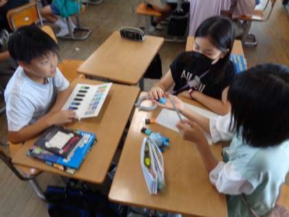 最初の1時間は、MESHの7つのブロックにどんな機能があるのかを知り、それらのブロック、モーター、豆電球等を組み合わてどんな装置をつくりたいか、グループでアイディアを出し合いました。