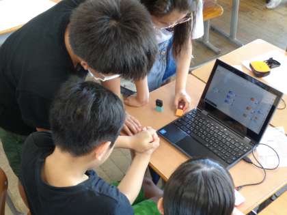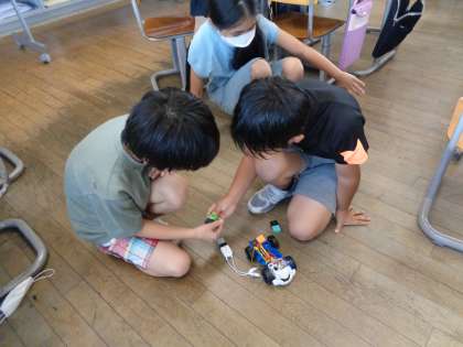 「スイッチをオンにするプログラムができたから車が走り出したけど、オフにするプログラムをつくってないから車が止まらない!」「じゃあボタンを押したら車が止まるようにしよう」というように、失敗をもとに修正する姿も見られました。