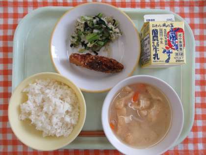 今日の献立は、ごはん、魚の竜田あげ、梅肉あえ、白玉汁、牛乳です。
