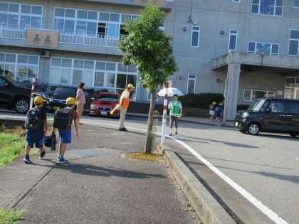 それを、地域の交通指導の方々が、笑顔で迎えてくださいます。