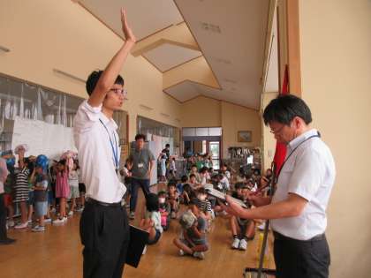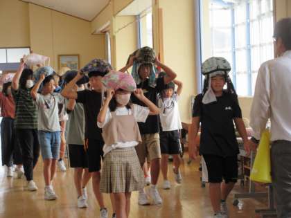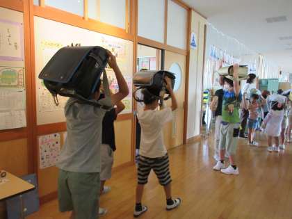 揺れが収まった後は、頭を守りながら避難です。みんな真剣に行っていました。