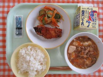 今日の献立は、ごはん、魚の利休揚げ、華風和え、豆腐の野菜あんかけ、のりの佃煮、牛乳です。