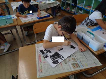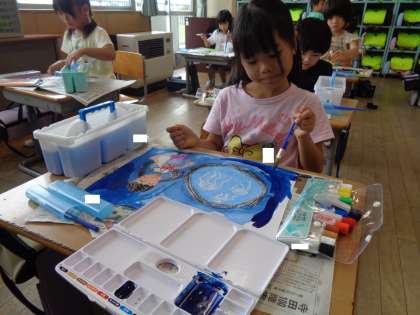 図画工作科の学習では、前回の学習で描いた夏休みの思い出の仕上げをしました。背景の色はどうするかよく考えて丁寧に塗っていました。