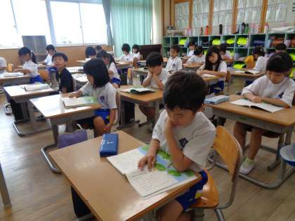 国語の範読を聞く学習では、どこを読んでいるのか、どの文字を読んでいるのかが分かるように、指で文字を追いながら聞く練習をしています。耳で聞いて文章を覚えることも大切ですが、文字を読む力を重点的に身につけていきます。