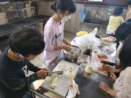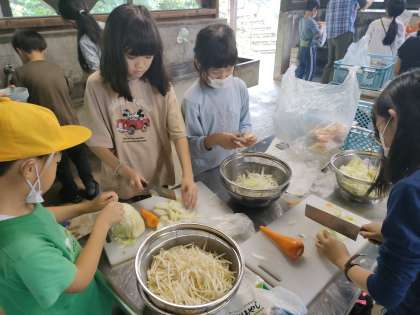 野外炊飯では、焼きそばづくりに挑戦します。火を起こしたり、野菜を切ったり洗ったり…経験の少ない子供たちですが、安全に気を付けて活動しています。美味しい焼きそばができ上がるのが楽しみです。