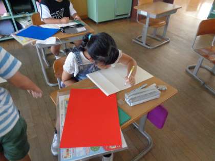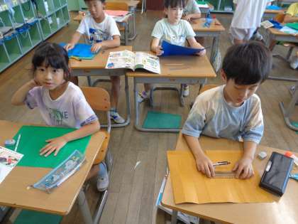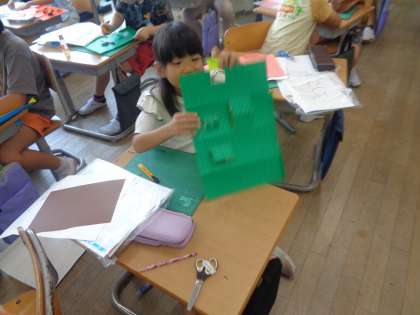 図画工作科の学習では、窓を開けたら、どのような生き物や景色が見えるか想像しながら作品の制作に取り組みました。窓の形にも工夫を凝らし、丁寧にカッターで切る姿が見られました。