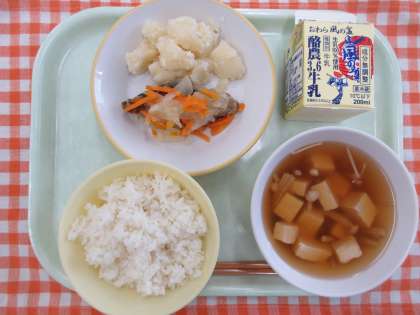今日の献立は、ごはん、ふくらぎのマリネ、こふきいも、すまし汁、牛乳です。