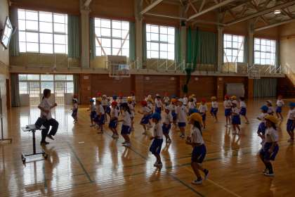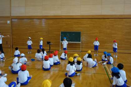 体育科の表現運動の学習の様子です。先生の動きをよく見て、動物になりきる姿が見られました。