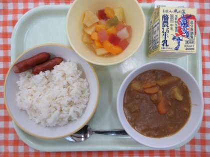 今日の献立は、ごはん、カレーライス、あらびきウインナー、フルーツカクテル、牛乳です。