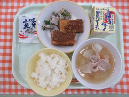 今日の献立は、ごはん、揚げ出し豆腐のごまだれがけ、ゆかりあえ、豚汁、味付け小魚、牛乳です。