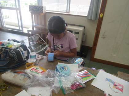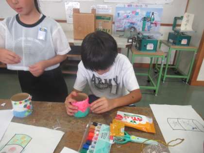 今日の図画工作科の時間に空き箱を利用して鉛筆立てを作りました。