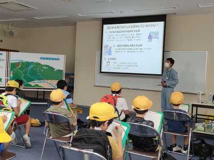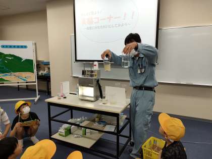 浄水場に着きました。川の水をきれいにする仕組みをスライドや実験で教えていただきました。